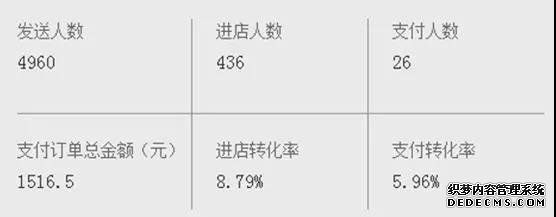 店家發(fā)送活動營銷短信給4960位客戶,每條短信成本僅為0.022元,該批次短信帶來的支付訂單總金額為1516.5元,ROI高達(dá)13.8。