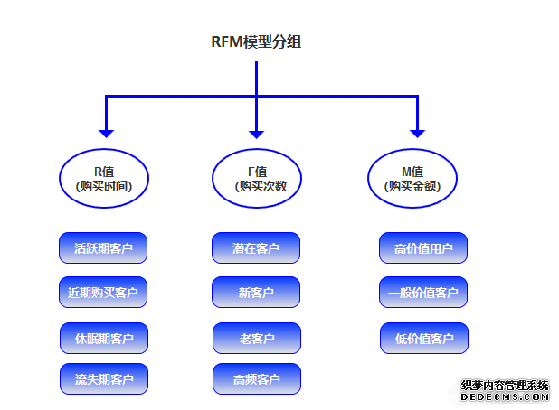 對(duì)于短信營(yíng)銷,常用的就是FRM模型分組的方式,如下圖,然后有效組合下圖的R值、F值、M值三個(gè)條件,再結(jié)合一些細(xì)分的分組條件來(lái)細(xì)分客戶,做更加精準(zhǔn)的營(yíng)銷,提升短信的效果,提升ROI等;