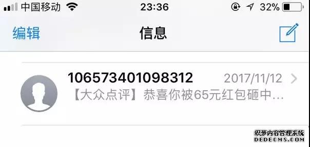 短信比較弱勢的地方就是單一色的文字表達,容易讓人產生視覺疲勞,抓不到重點詞匯而放棄閱讀。還是用這個案例,假如“恭喜你被65元紅包砸中…”調整為“恭喜你被很多紅包砸中…”,是否增加了用戶的閱讀成本?也就是說,適當的通過數字表達意愿,能夠更快速的抓住用戶的眼球,促使用戶有繼續閱讀的欲望。