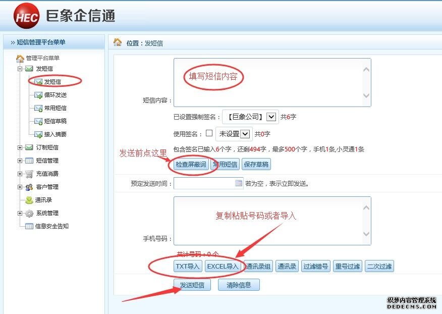 登錄sms.hechina.cn進入巨象企信通短信群發平臺登錄界面,短信帳號和密碼,點擊登錄,進入平臺后,點發短信按鈕,如圖:
