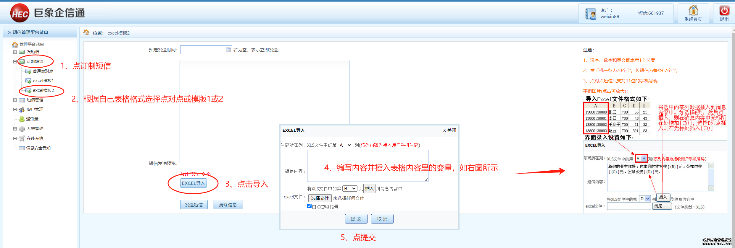 (二)個性化變量短信群發(fā)操作,即需要做到一個批次群發(fā)的手機(jī)號碼收到的內(nèi)容不完全一樣,如內(nèi)容里加入稱呼、工資條、物業(yè)費、賽事編號、座位號、學(xué)號等,如下圖所示
