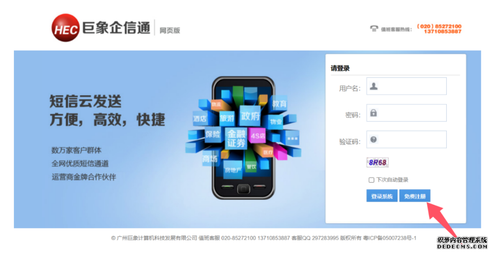 一、首先我們用電腦或手機登錄企信通短信平臺sms.hechina.cn網頁,在如下圖所示部位,點擊免費注冊。