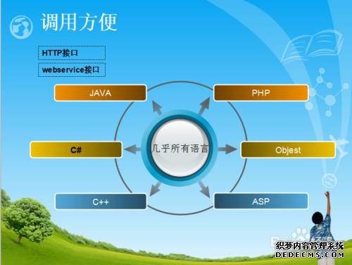 API接口: API接口的實現使用了WebService的方式,用戶通過調用WebService的指定接口函數以達到發送短信的目的,這樣也是快速接入的一種方法,并且提供主流開發語言的DEMO,方便開發者快速接入。